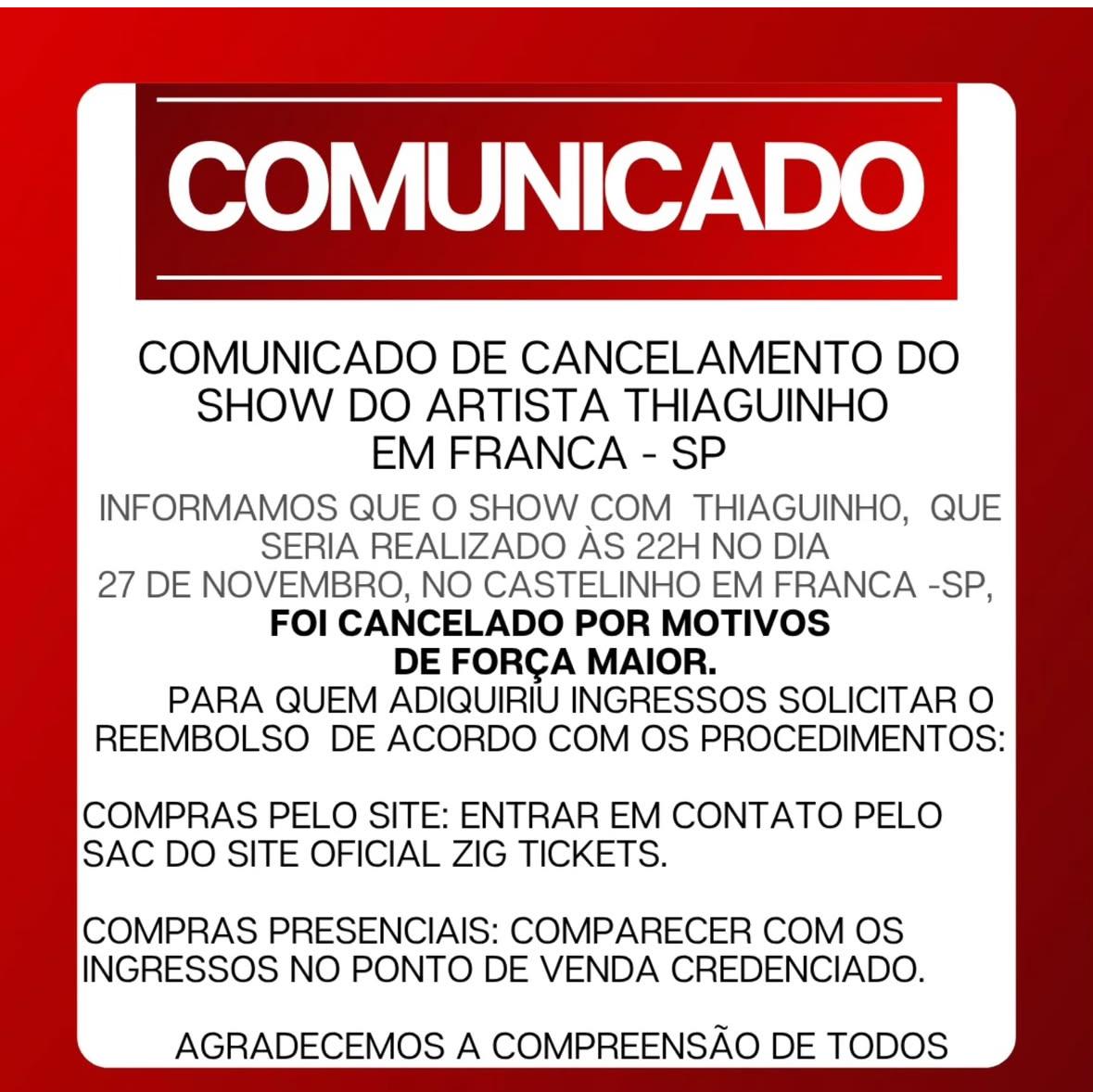 #Franca #Thiaguinho #ShowCancelado #Cultura #Eventos #Entretenimento #F3Notícias #Região #Notícia #Atualização #Show