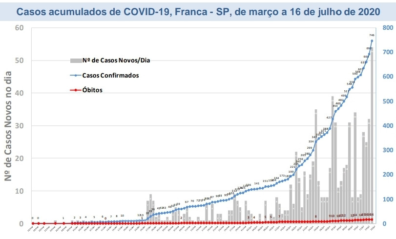“A Vigilância Epidemiológica da Prefeitura de Franca informa o registro de mais 54 casos positivos da Covid -19, nesta quinta-feira, 16 de julho, aumentando o número para 746. O quadro de óbitos segue em 16. O número de suspeitos caiu para 201, enquanto os registros negativos aumentaram para 1.230. A ocupação de leitos clínicos é de 27 leitos dos 45 disponíveis. A ocupação de leitos de UTI SUS é de 17 leitos dos 22 disponíveis. A ocupação de leitos de UTI Particulares é de 11 leitos dos 15 disponíveis”, detalhou nota oficial da Prefeitura.