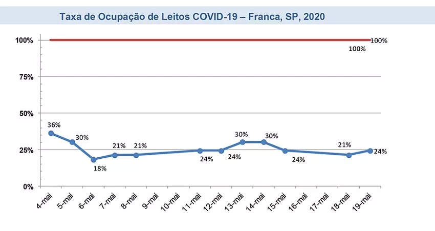 No quadro geral de internações, há oito pessoas em hospitais, sendo cinco no CTI e outras três sendo monitoradas em enfermaria. Essa quantidade é a mesma divulgada pela Prefeitura no dia anterior. Estatística divulgada neste dia 19 mostra que a taxa de ocupação de leitos em Franca está abaixo dos 30%, situação que pode ser considerada favorável. Autoridades de saúde ponderam que o cenário permanece nessa situação na cidade por conta do distanciamento social, que acontece desde 20 de março.