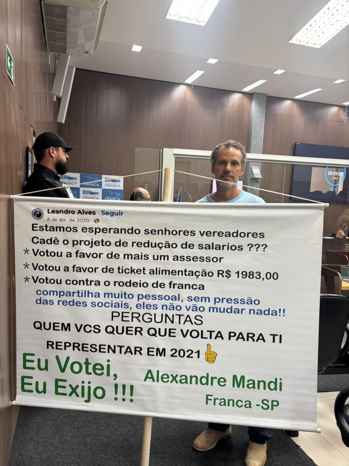 A sessão contou com a presença de poucos munícipes no plenário, mas foi marcada por um protesto individual. O cidadão Alexandre Mandi acompanhou os trabalhos exibindo um cartaz com a frase “Eu votei, eu exijo”, cobrando promessas feitas durante a campanha eleitoral. Entre os pontos levantados, ele questionou o aumento dos salários dos vereadores, a ampliação do número de assessores, a ausência de eventos de grande porte na cidade, como o rodeio, e criticou a destinação de R$ 6 milhões para publicidade institucional da Prefeitura em 2026, defendendo que parte desse recurso pudesse ser direcionada a áreas prioritárias, como saúde e segurança. Tentamos falar com o Vereador Leandro Patriota sobre a questão, mas não conseguimos.