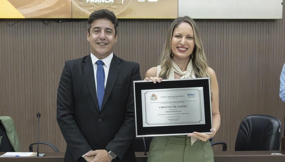 Em uma noite marcada por reconhecimento e emoção, a Câmara Municipal de Franca realizou, nesta quinta-feira (19), sessão solene para a entrega do título de cidadã francana à advogada Cristiany de Castro, em reconhecimento à sua trajetória profissional e ao trabalho desenvolvido em prol da inclusão social no município.
