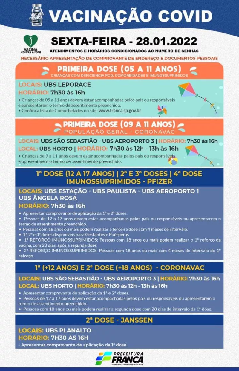 A Prefeitura de Franca divulgou a relação dos postos e os horários de atendimento para vacinação contra a covid-19 nesta sexta-feira (28). Veja os detalhes abaixo.